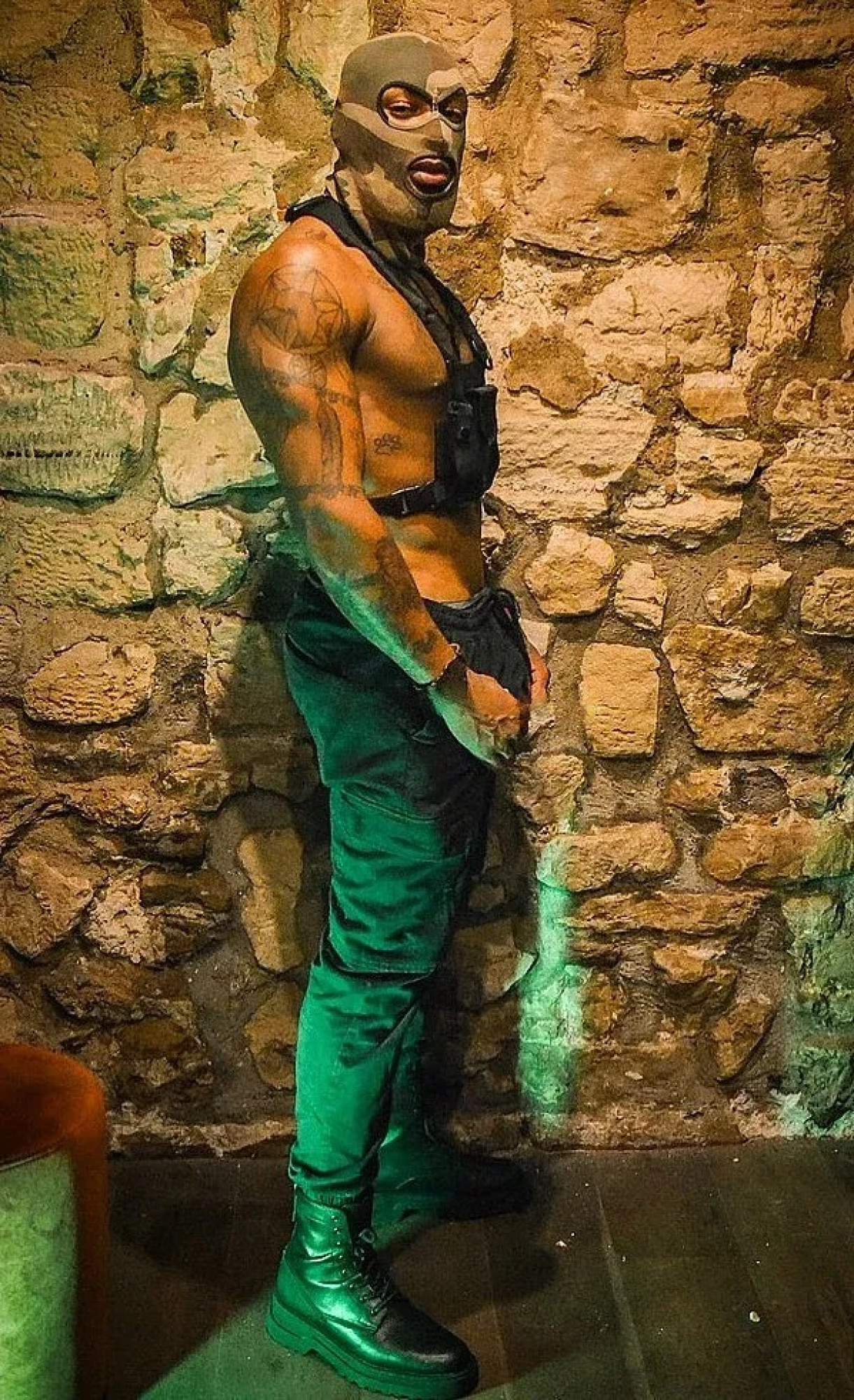 Homme au physique athlétique, arborant des tatouages et affichant une virilité assumée.